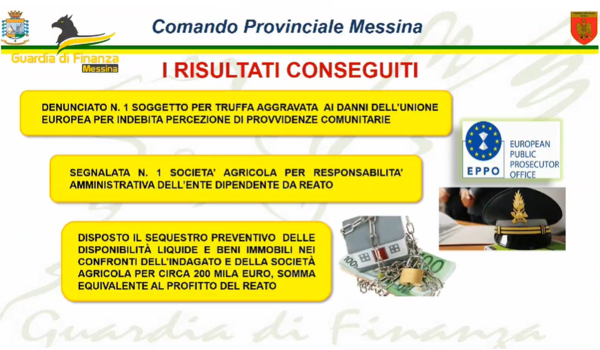 Fraude contra a União Europeia com certificados falsos de propriedade de terras agrícolas. Administrador de empresa agrícola foi denunciado e foram apreendidos bens no valor de cerca de 200 mil euros. Os financiadores do Comando Provincial de Messina, na conclusão de uma complexa investigação coordenada pela Procuradoria Europeia de Palermo – Eppo (Ministério Público Europeu), denunciaram o responsável pelo recebimento indevido de financiamento comunitário no âmbito do política agrícola comum e realizou um decreto de apreensão preventiva para efeitos de confisco, no valor aproximado de 200 mil euros.